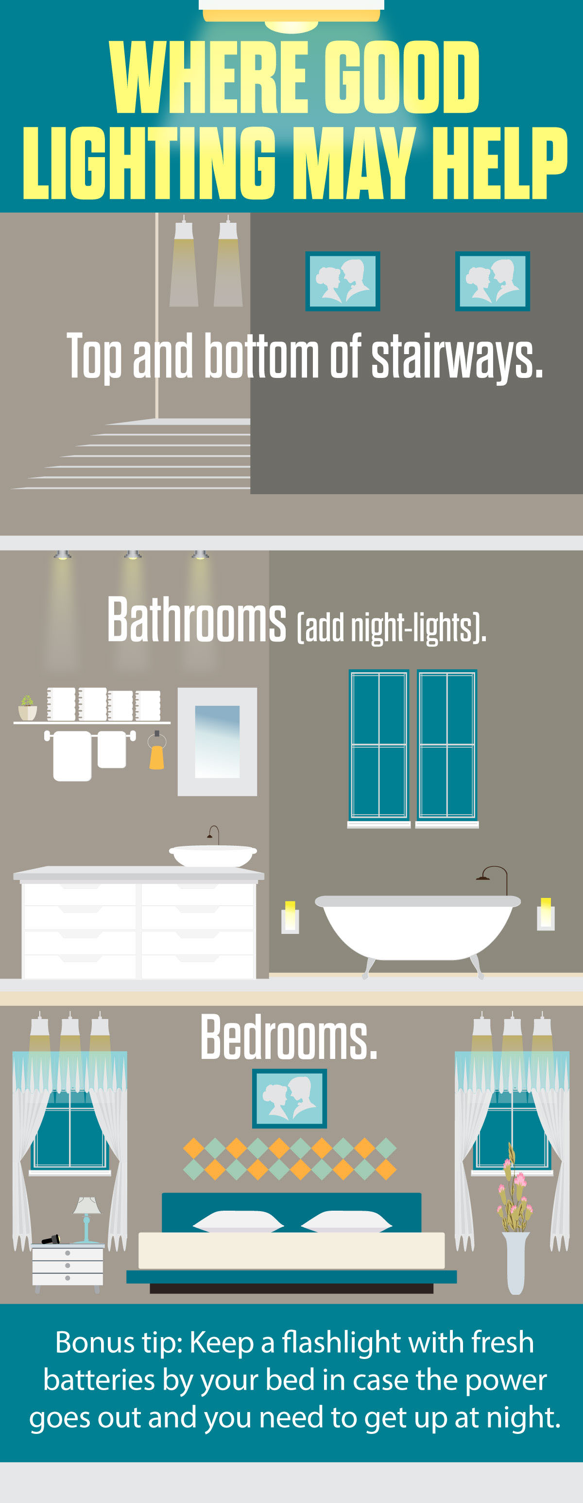 - Bathrooms (add night-lights).