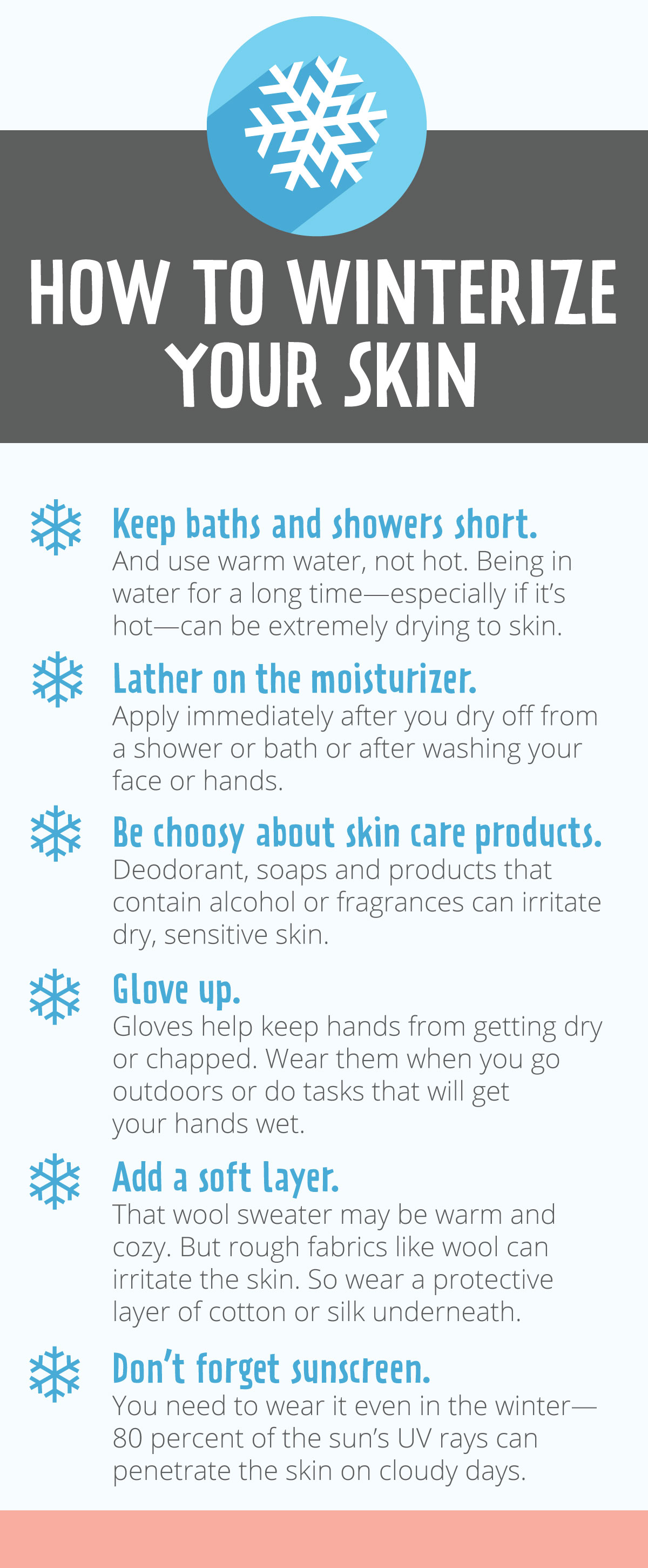 Keep baths and showers short. And use warm water, not hot. Being in water for a long time—especially if it's hot—can be extremely drying to skin.